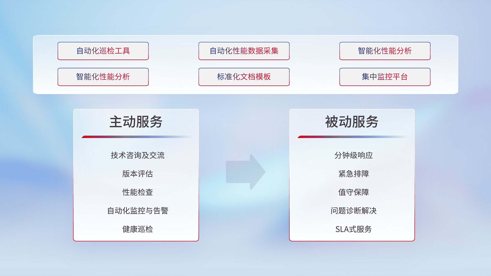 智能化工具和标准化文档,,,,保障服务质量,,,提供主动服务(包含技术咨询、、、、版本评估、、、性能检查、、自动化监控与告警、、、健康巡检)和被动服务包含(分钟级响应、、紧急排障、、、值守保障、、、问题诊断解决、、SLA服务)。。。